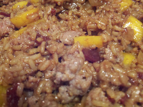 This morning I found a pound of Turkey Sausage in my freezer. I thawed it throughout the day, but didn't know what I had planned for it until I opened my pantry later.